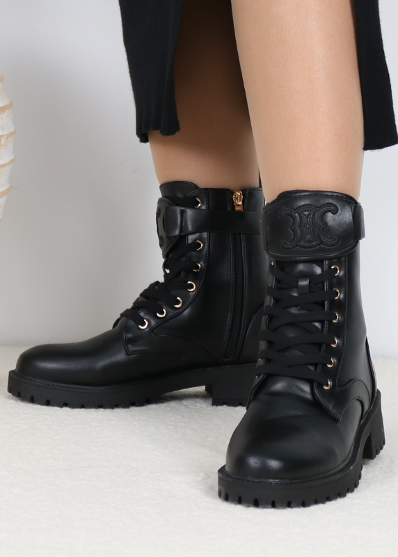 -Bottines noires en similicuir- Style militaire avec lacets à l’avant – Semelle épaisse crantée pour une meilleure adhérence – Fermeture éclair sur le côté pour un enfilage facile – Surpiqûres apparentes au niveau de la semelle -Design moderne et polyvalent, adapté à différentes tenues.
