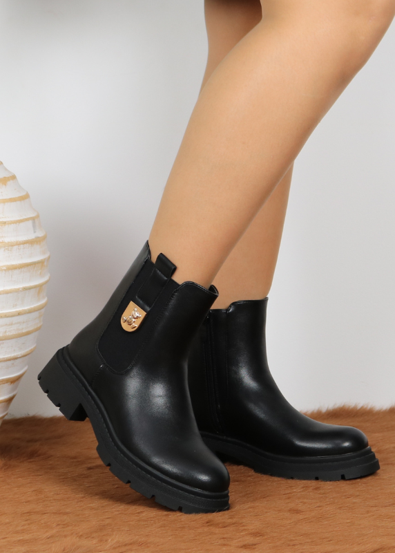 -Une paire de bottines en similicuir – Design épuré avec une semelle robuste et crantée – Fermeture éclair latérale pour faciliter l’enfilage – Bande élastique sur le côté pour un confort supplémentaire.