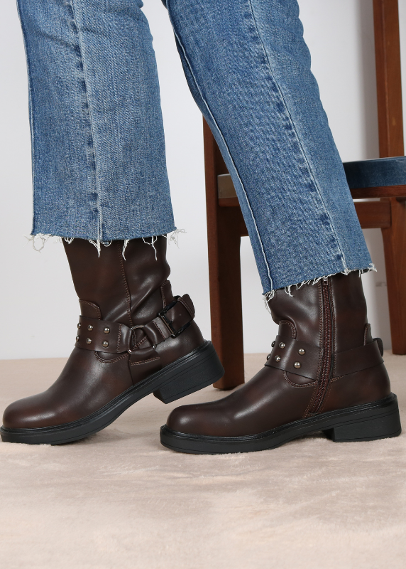 -Une paire de bottines en similicuir – Design épuré avec une semelle robuste et crantée – Fermeture éclair latérale pour faciliter l’enfilage – Bottines élégantes dotées d’une ceinture décorative sur le côté.
