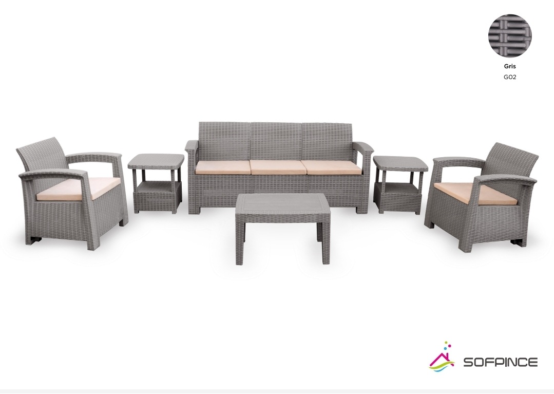 Salon de jardin SOFPINCE Syphax – 5 places – 2 Fauteuil 1 place: 60 cm – 1 Divan 3 places: 175 cm – 1 Table basse: 70 cm – 2 Table de coin: 50 cm – Poof Beige – Profitez de belles journées sous le soleil dans votre terrasse ou dans votre jardin, confortablement installé dans le jardin – Couleur: Gris