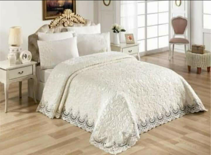 Couverture de lit Dentelle Blanc comprend 6 pièces : Couverture 240*240 -Drap plat 235*235- 2 taies d’oreillers : 50*70 -2 taies d’oreillers brodées : 50*70