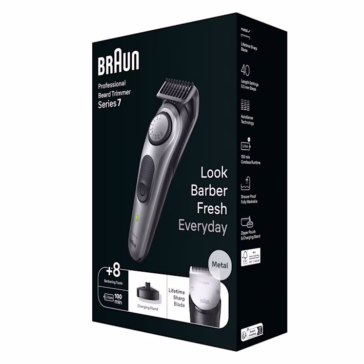 Tondeuse à barbe Series 7 BT7420 avec lame ProBlade, bouton de précision – Utilisation: Sans fil – 8 Outils de professionnel – Rechargeable – 100 Minutes d’autonomie – Mode d’alimentation: Batterie – 40 réglages de longueurs – Longueur min de coupe: 0.5 – Longueur max de coupe: 40 mm – Waterproof – Couleur Gris- Garantie 1 an