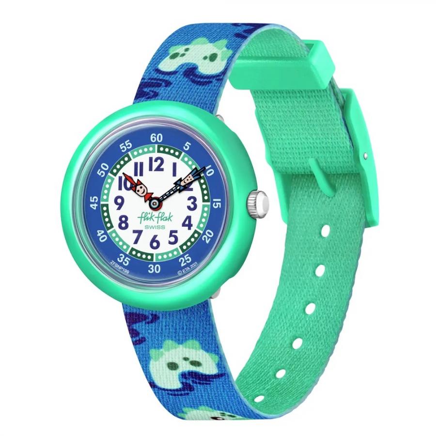 Montre FLIK FLAK Pour Enfant Style Moderne avec bracelet en textile couleur Bleu et un fond bleu dans un boitier Rond.