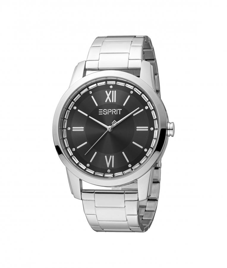 Montre ESPRIT Pour Femme Style Moderne avec bracelet en Acier inoxydable couleur Argent et un fond Noire dans un boitier Rond.