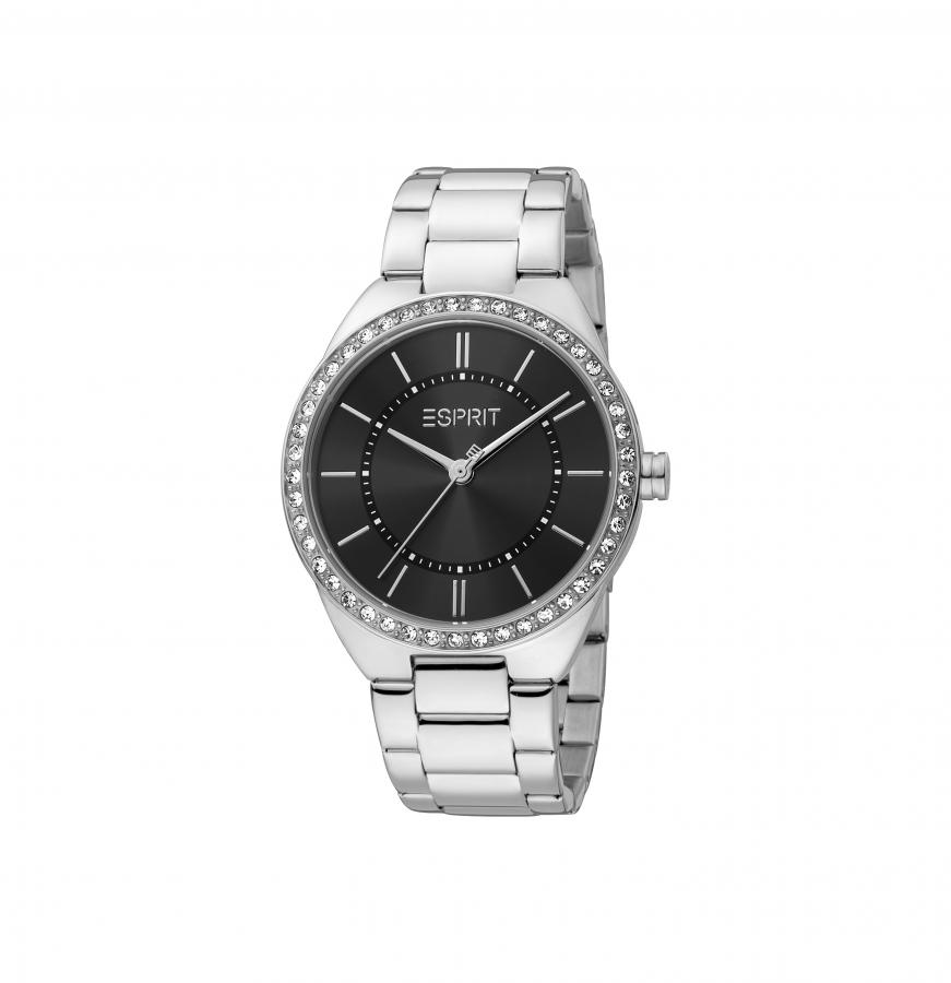 Montre ESPRIT Pour Femme Style Moderne avec bracelet en Acier inoxydable couleur Argent et un fond Noire dans un boitier Rond.