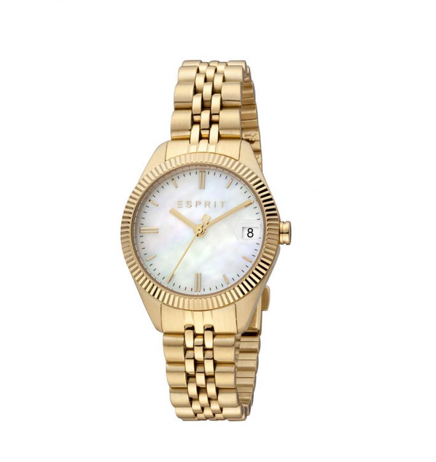 Montre ESPRIT Pour Femme Style Moderne avec bracelet en Acier doré couleur Doré/jaune et un fond Nacre dans un boitier Rond.