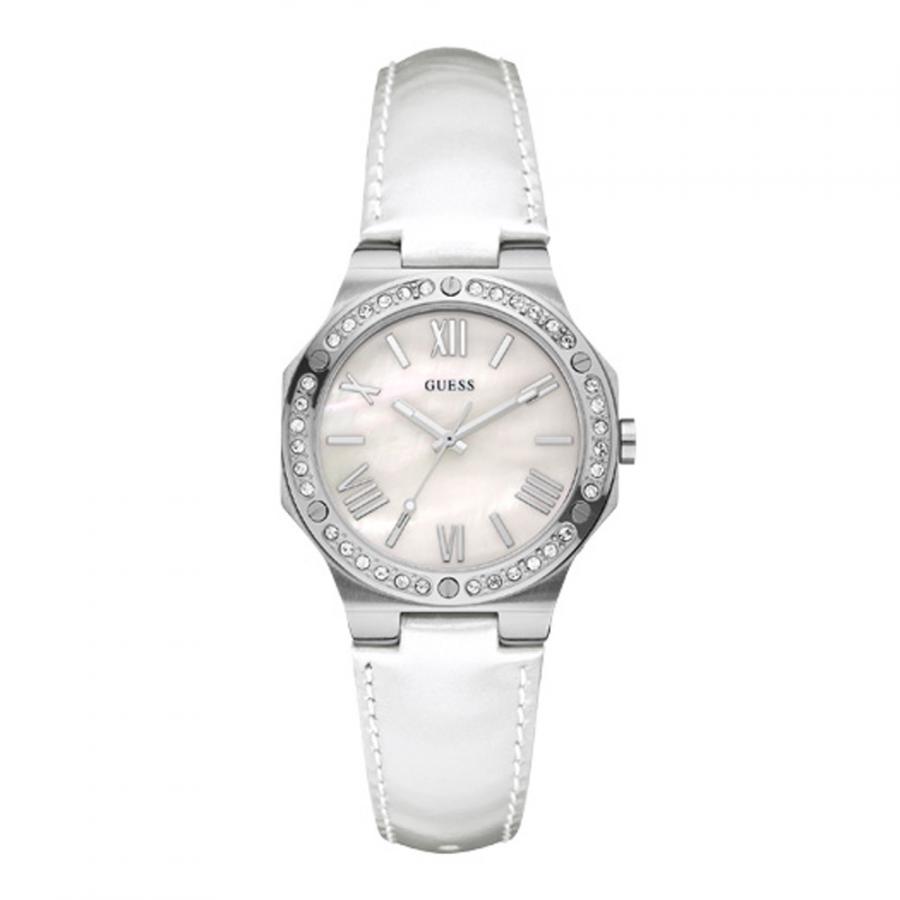 Montre GUESS Pour Femme Style Moderne avec bracelet en Cuir couleur Blanc et un fond Nacre dans un boitier Rond.
