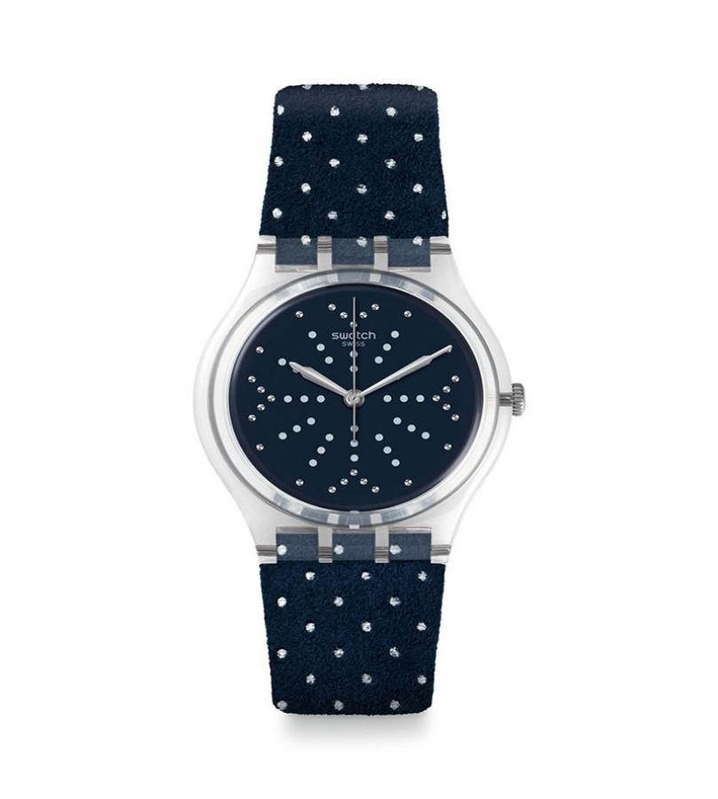 Montre SWATCH Pour Femme Style Moderne avec bracelet en cuir sur textile couleur Bleu et un fond bleu dans un boitier Rond.