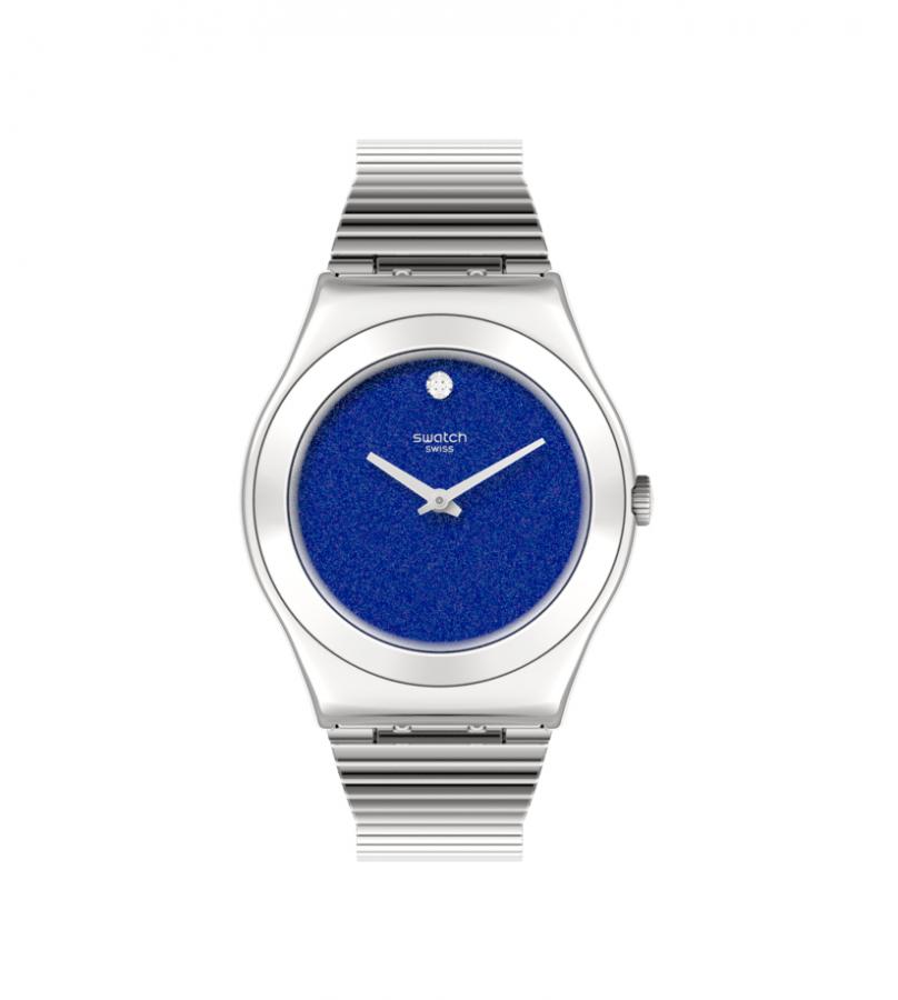 Montre SWATCH Pour Femme Style Moderne avec bracelet en Acier inoxydable couleur Argent et un fond bleu dans un boitier Rond.