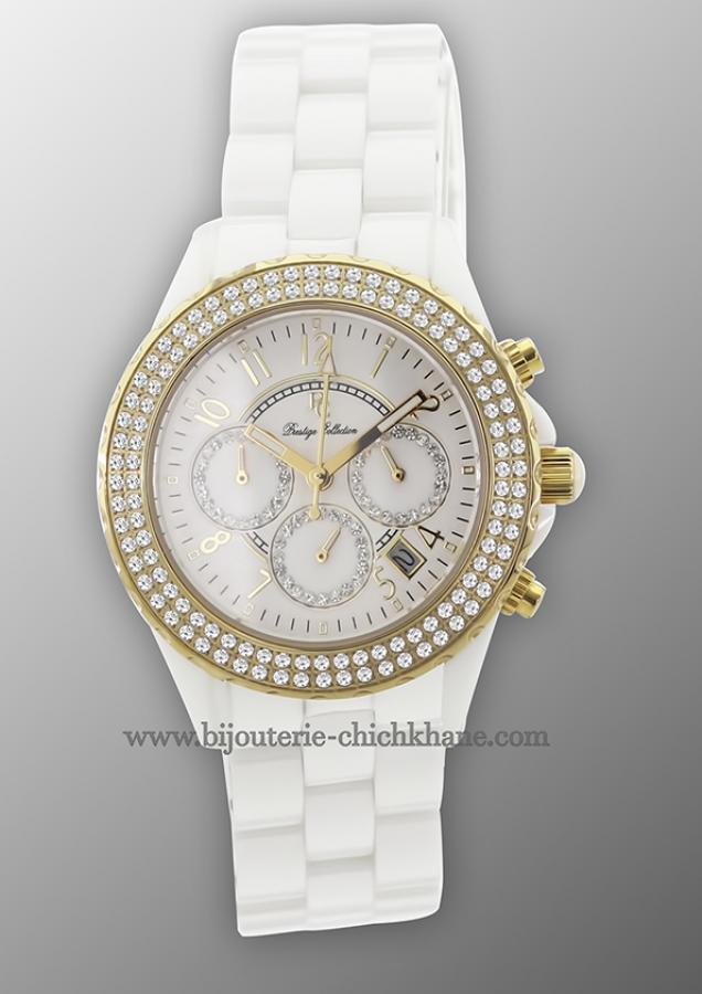 Montre PRESTIGE COLLECTION Pour Femme Style Moderne avec bracelet en Céramique couleur Blanc et un fond Blanc dans un boitier Rond.
