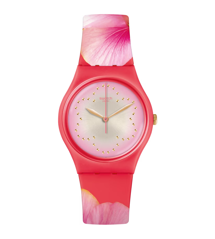 La Swatch Fiore Di Maggio, numéro de référence GZ321, est une montre fabuleuse qui présente de fabuleux accents floraux. Un boîtier en plastique de 34 mm est doté d’un cadran rose rehaussé de clous dorés de forme florale le long du périmètre, qui est magnifiquement complété par des aiguilles des heures et des minutes en or. Une sangle en silicone à motifs floraux le rend à la fois confortable et facile à porter. Malgré son apparence à couper le souffle, il est également incroyablement fonctionnel – il est alimenté par un mouvement à quartz et résiste à l’eau jusqu’à 30 mètres. Ce garde-temps est proposé dans un état non porté et comprend la boîte et les papiers du fabricant.
