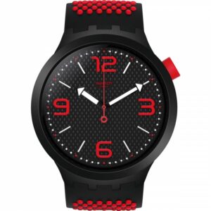 Manque de boîtier en plastique avec un bracelet en silicone noir et rouge. Lunette fixe en plastique noir. Cadran noir avec aiguilles et index noirs lumineux. Des chiffres arabes marquent les positions 3, 6, 9 et 12 heures. Index des minutes autour du bord extérieur. Type de cadran : Analogique. Aiguilles et index luminescents. Mouvement à quartz. Cristal de plexiglas. Couronne de traction / poussée. Fond solide. Forme du boîtier rond. Taille du boîtier : 47 mm. Épaisseur du boîtier : 11,75 mm. Largeur de la bande : 23 mm. Fermoir à languette. Résistant à l’eau à 30 mètres / 100 pieds. Fonctions : heure, minute, seconde. Style de montre décontracté. Swatch BBBlood Montre Homme Cadran Noir SO27B102.