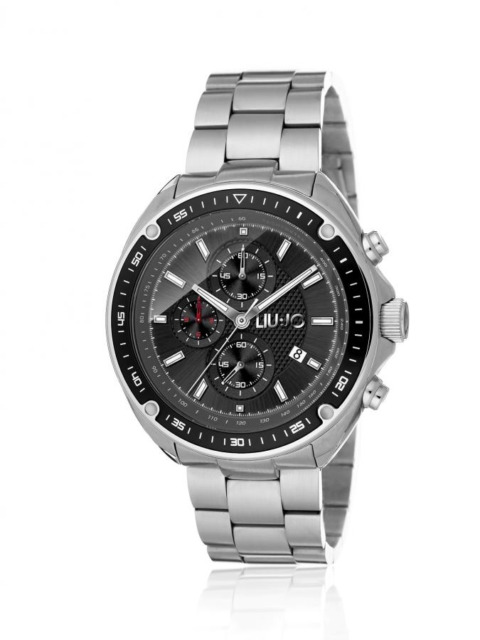 Montre LIU.JO Pour Homme Style Moderne avec bracelet en Acier inoxydable couleur Argent et un fond Noire dans un boitier Rond.