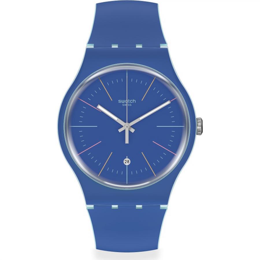 Montre SWATCH Pour Homme Style Moderne avec bracelet en Silicon couleur Bleu et un fond bleu dans un boitier Rond.