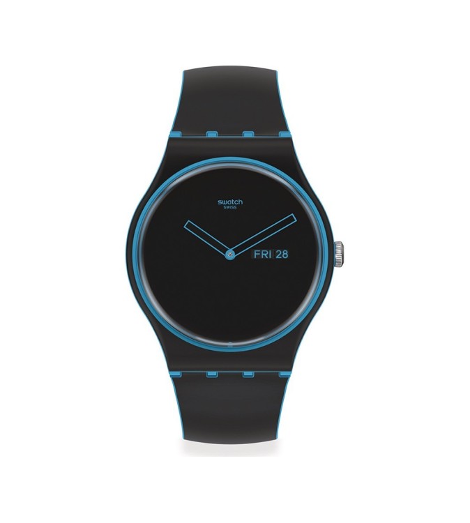 Boîtier en matière biosourcée noire avec un bracelet en silicone noir. Lunette bleue fixe. Cadran noir avec aiguilles bleues. Type de cadran : Analogique. Affichage du jour de la semaine et de la date à 3 heures. Mouvement à quartz. Cristal plexiglas résistant aux rayures. Couronne de traction / poussée. Forme du boîtier rond, taille du boîtier : 41 mm, épaisseur du boîtier : 9,85 mm. Fermoir à boucle. Résistant à l’eau à 30 mètres / 100 pieds. Fonctions : heure, minute. Style de montre décontracté. Swatch ligne minimale quartz bleu cadran noir montre homme SO29S701.