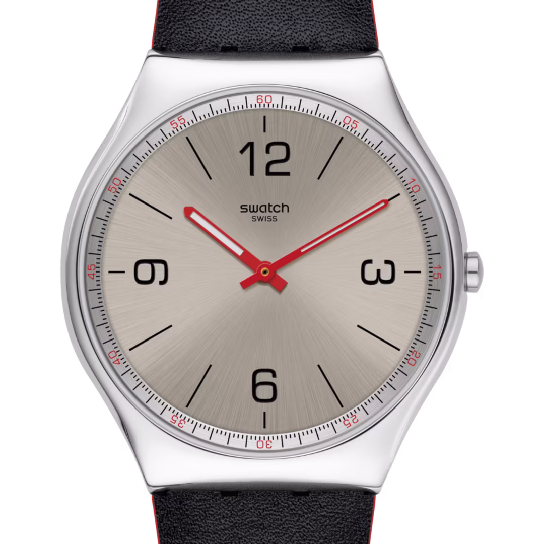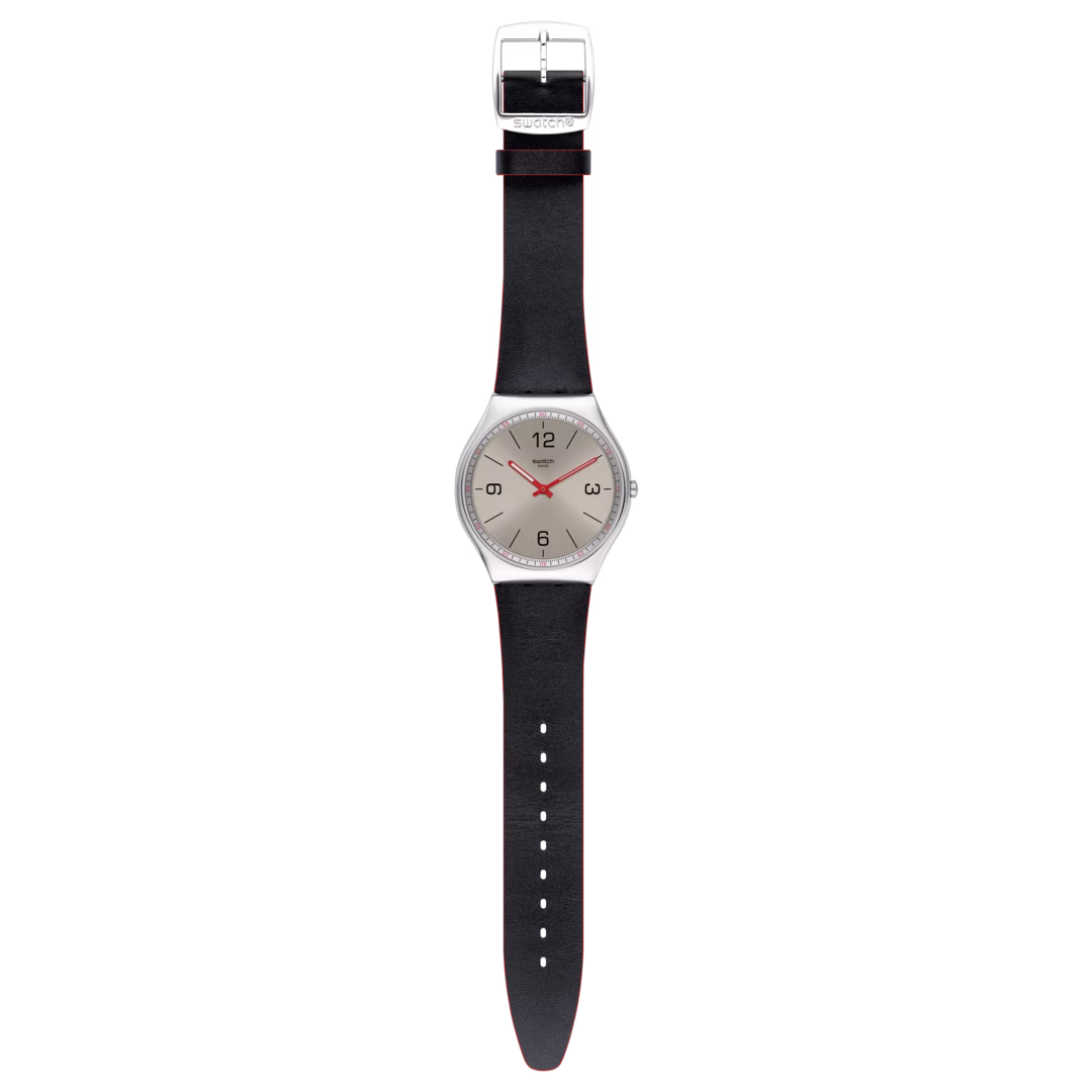 Boîtier en acier inoxydable avec bracelet en cuir noir. Lunette fixe en acier inoxydable. Cadran argenté avec aiguilles rouges lumineuses et index index. Les chiffres arabes apparaissent aux positions 3, 6, 9 et 12 heures. Marqueurs des minutes en chiffres arabes (à 5 minutes d’intervalle). Marqueurs Mnute autour du bord extérieur. Type de cadran : Analogique. Aiguilles et index luminescents. Mouvement à quartz. Cristal plastique. Couronne de traction / poussée. Fond solide. Forme du boîtier rond. Taille du boîtier : 42 mm. Épaisseur du boîtier : 6,7 mm. Largeur de l’anneau : 19 mm. Fermoir à soie. Résistant à l’eau à 30 mètres / 100 pieds. Fonctions : heure, minute. Informations supplémentaires : bords rouges sur la bande. Série Skinmetal. Style de montre de mode. Montre Swatch Skinmetal Silver Dial pour homme SS07S104.