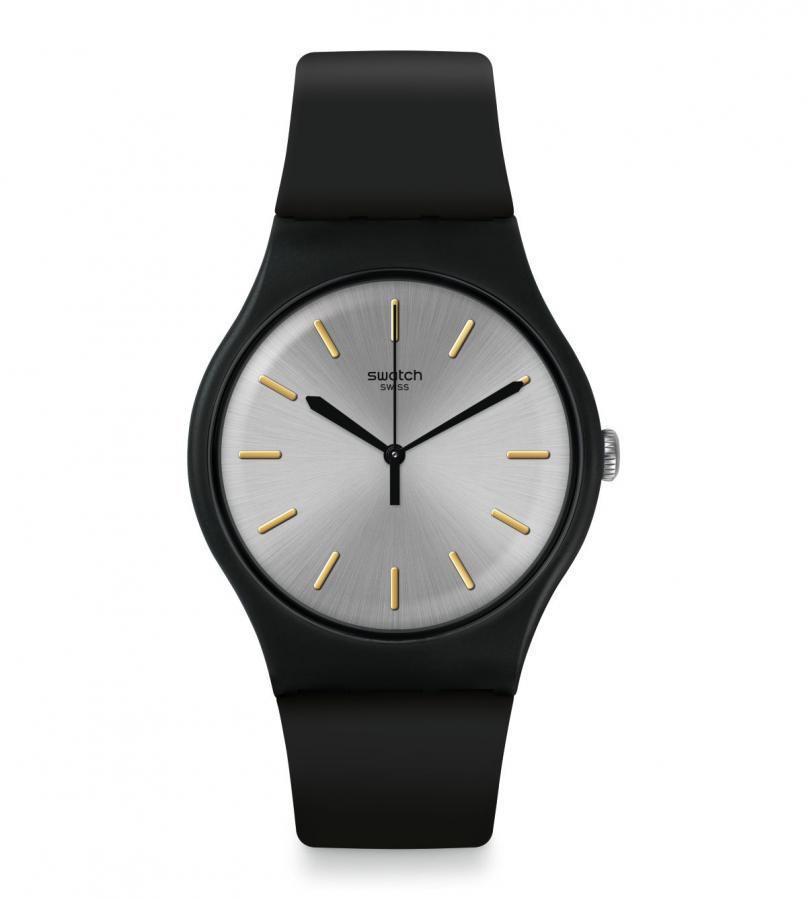 Montre SWATCH Pour Mixte Style Moderne avec bracelet en Silicon couleur Noire et un fond Gris dans un boitier Rond.