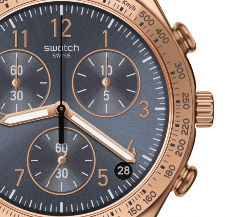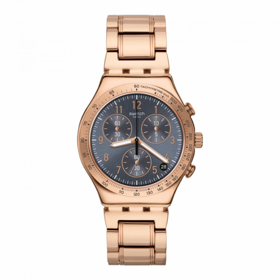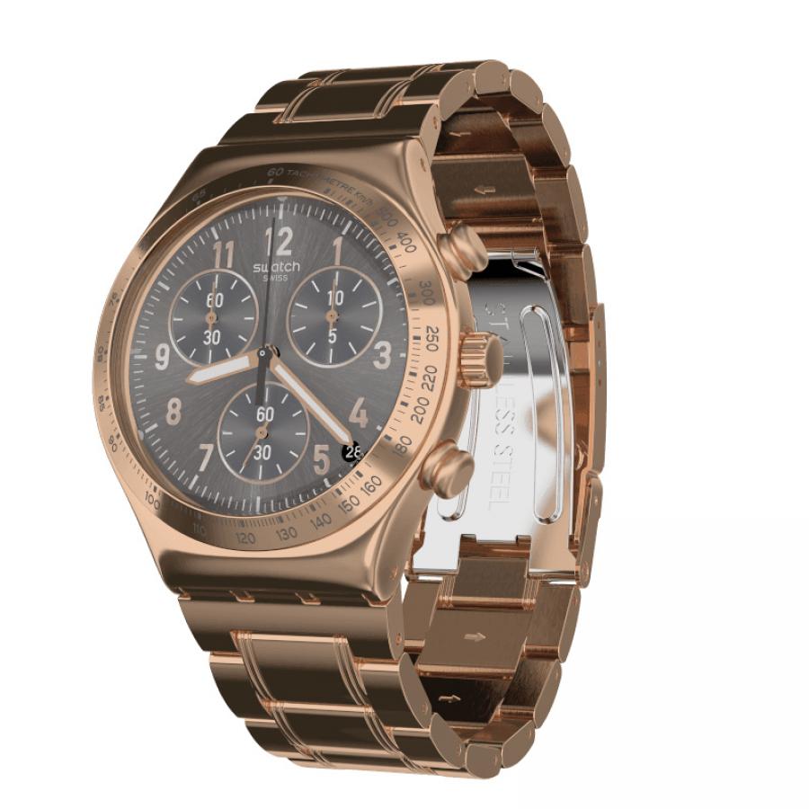 Montre pour Femme Swatch ELEGANTUM YCG418GD – Fonctions Chrono et Date – Mouvement Quartz – Etanche 3 bar – Boitier, Fermoir et Bracelet en Acier Inoxydable – Couleur Rose Gold – Boitier Rond – Cadrand Gris – Garantie 2 ans