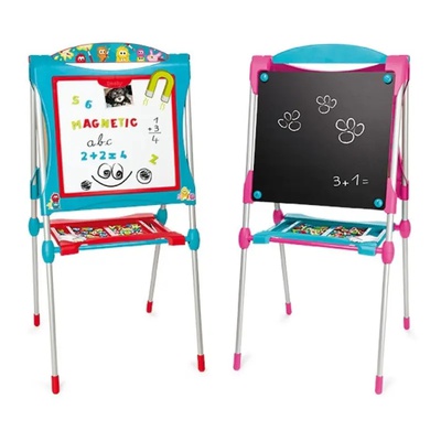 Tableau métal double face : 1 pour dessiner avec un feutre effaçable ou s’amuser avec des lettres magnétiques, 1 pour dessiner avec des craies de couleur -Se plie pour un rangement facile-4 compartiments de rangement pour les accessoires-80 accessoires inclus. Dès 3 ans. Dim : 63x63x125cm