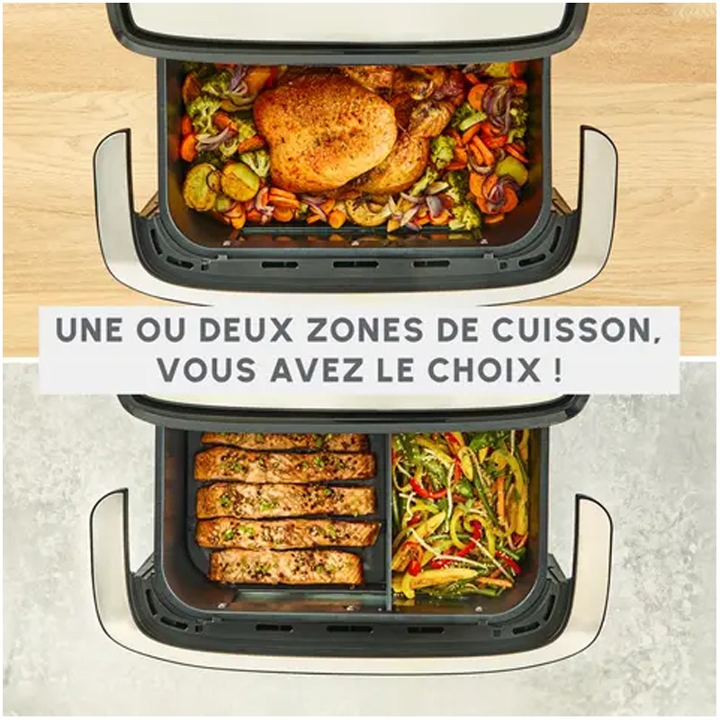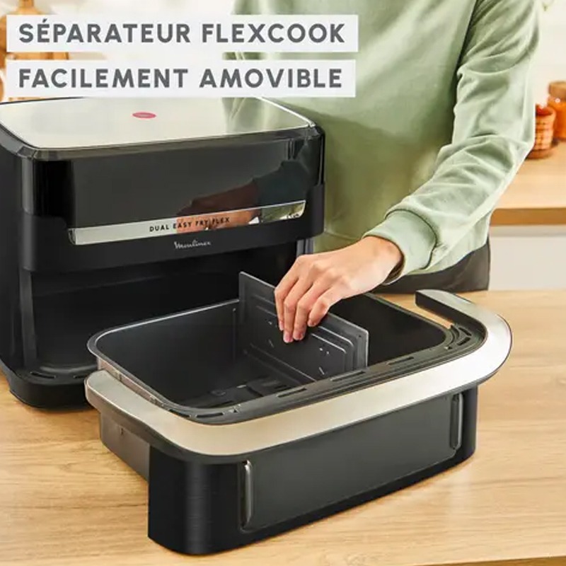 Friteuse Sans Huile MOULINEX – Puissance: 2700 Watts – Capacité: 9 Litres (2 zones: 5.5 Litres + 3.5 Litres) – Idéale pour jusqu’à 8 personnes – Température Réglable de 40 à 200 °C – 7 Programmes – Dual Easy Fry Flex – Arrêt automatique – Panneau de commande: Tactile – Éclairage intérieur – Économisez jusqu’à 70 % d’énergie – Séparateur amovible – Facile à Nettoyer – Couleur: Noir – Garantie: 1an