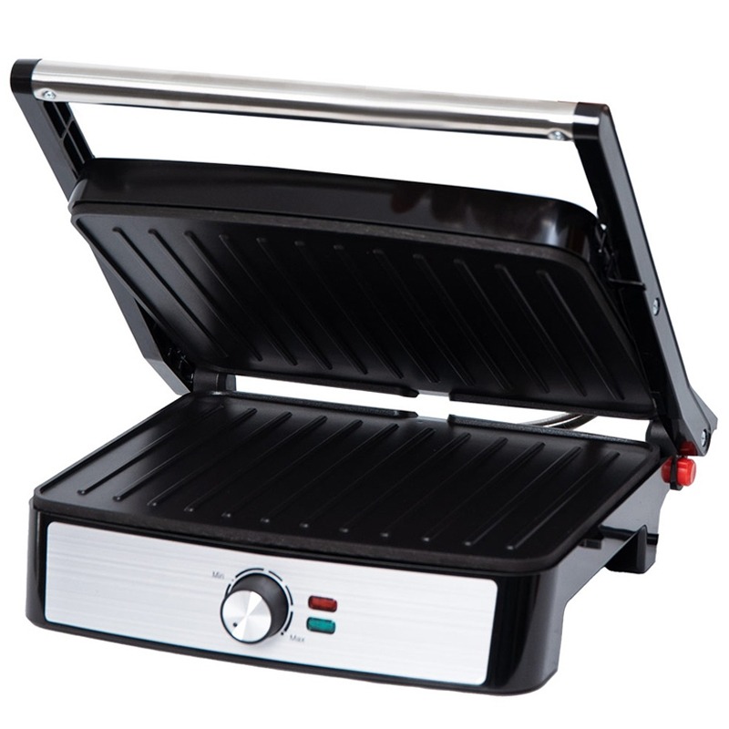 Gril à Viande FLORENCE – Puissance: 2200 Watts – Couvercle en acier inoxydable – Plaques à revêtement antiadhésif – Protection sécurité surchauffe – Poignée froide au toucher pour une sécurité optimale – Ouverture 180° pour usage en gril ouvert – Voyants lumineux – Pieds antidérapants – Charnière flottante automatique – Couleur: Chrome – Garantie: 1an