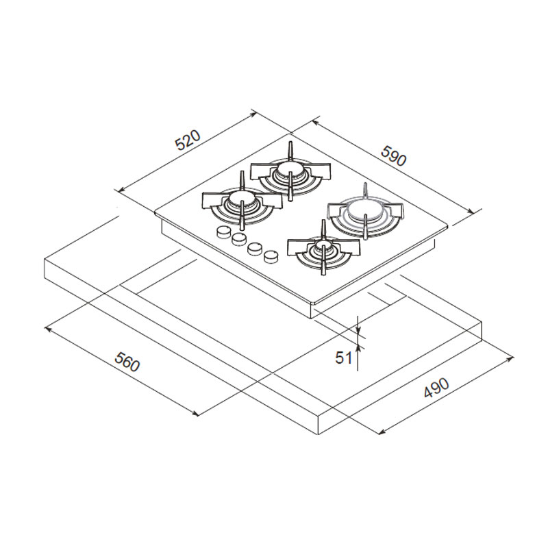Plaque de cuisson Encastrable FOCUS – Type de Plaque: à Gaz – Largeur: 60 cm – Nombre de Foyers: 4 foyers – Flamme stabilisée – Grilles et chapeaux de brûleurs émaillées – Commandes frontales – Allumage Automatique – Revetement vitro noir – Dimensions: H x L x P: 51 x 590 x 520 mm – Couleur: Noir – Garantie: 2 ans