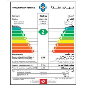 Climatiseur BIOLUX Tropicalisé – Puissance : 12000 BTU/H – Mode de refroidissement : Chaud & Froid – Classe énergétique : 2 – Classe Climatique : T3 – Type de Gaz : R410A – Smart : Oui