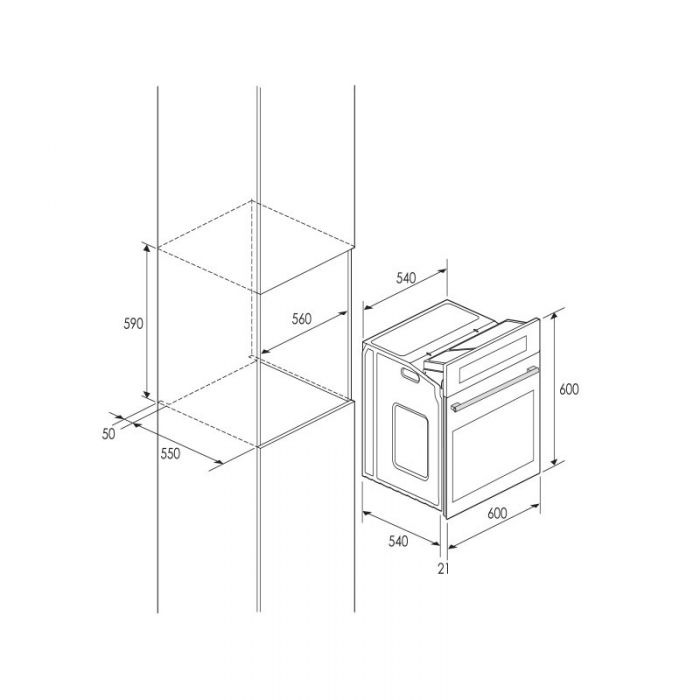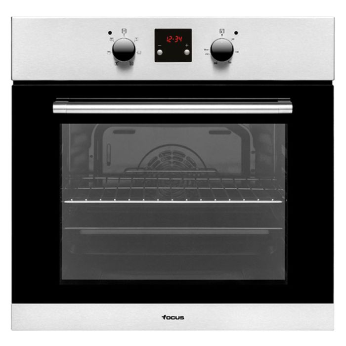 Four Encastrable Électrique FOCUS – Volume: 56 Litres – Largeur: 60 cm – Classe Energétique: B – 7 programmes – Chaleur tournante – Minuterie électronique – Boutons + Afficheur – Porte froide – Dimensions: 60 x 60 x 54cm – Couleur: Inox – Garantie: 2 ans
