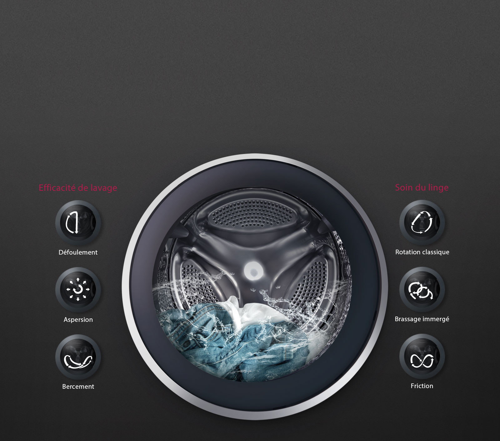 LG a recréé les mouvements de la lavandière avec la technologie 6 Motion DD. Grâce au moteur Direct Drive en transmission directe, le tambour reproduit des mouvements précis. Chaque mouvement correspond à un besoin du linge pour gagner en efficacité de lavage, en soin du linge et en silence.