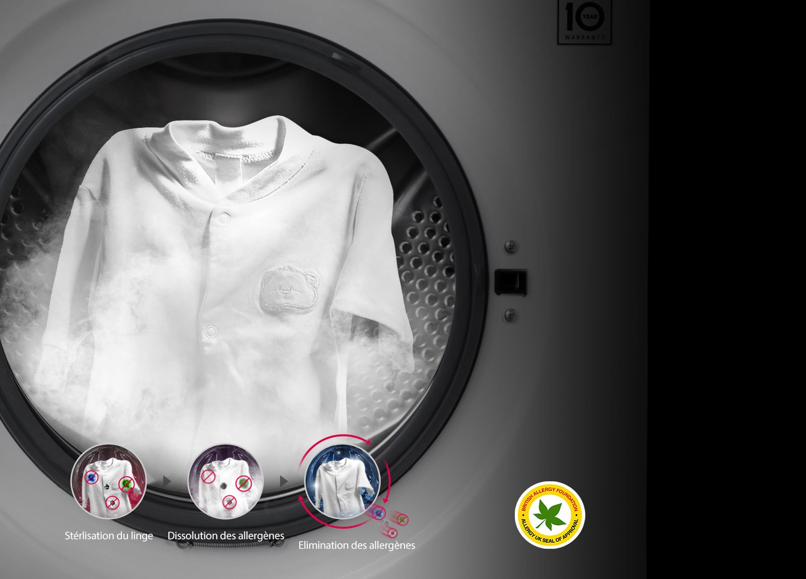 Le cycle Allergiene™ élimine les allergènes domestiques tels que les acariens et les squames d’animaux en utilisant des tempértures optimales. La stérilisation du linge pénètre les fibres avec de la vapeur pour les assainir profondément.Tous les allergènes sont supprimés pendant les cycles de rinçage et d’essorage.