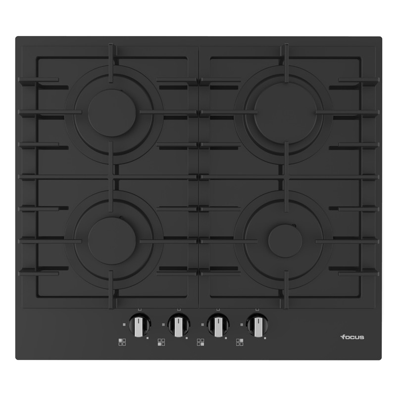Table de Cuisson Encastrable FOCUS – Largeur : 60cm – Nombre de bruleurs : 4 bruleurs à Gaz – Grilles et chapeaux de brûleurs en fonte – Flamme stabilisée – Commandes Frontales – Vitro Noir – Allumage Automatique – Dimensions : 520 x 590 x 51mm
