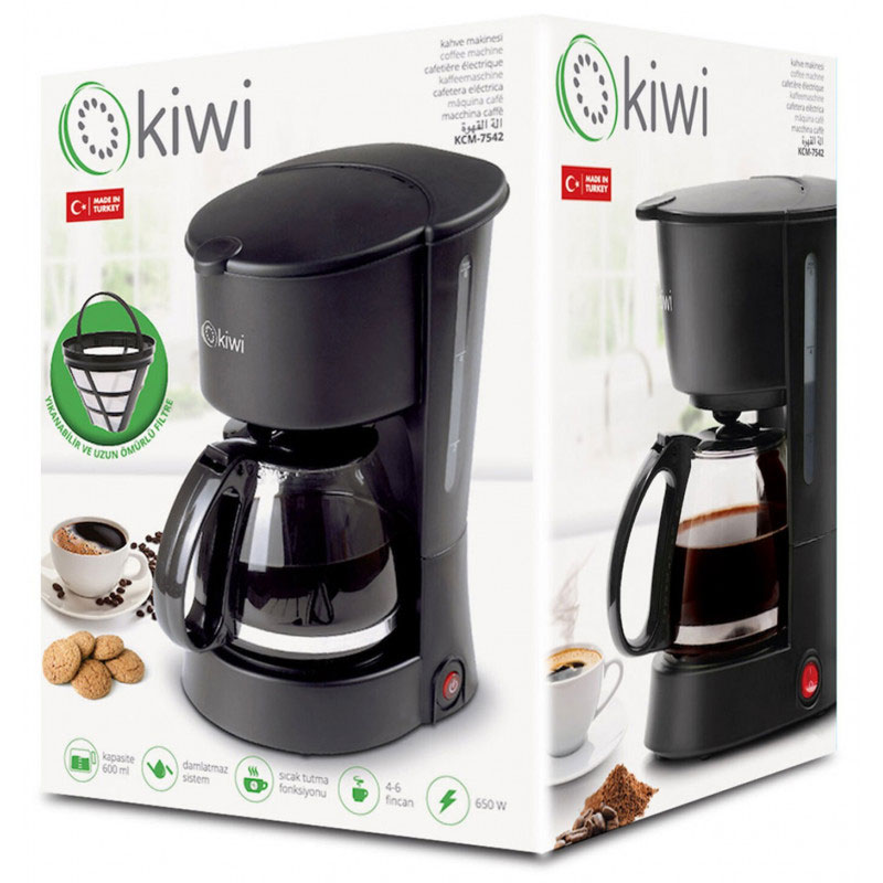Cafetière Electrique KIWI – Puissance: 680Watts – De 8 a 10 Tasses – Capacité: 1.2 Litre – Indicateur de niveau d’eau – Interrupteur marche / arrêt avec voyant lumineux – Système anti-goutte – Pot en verre avec indicateur de niveau – Fonction de maintien au chaud – Filtre lavable et longue durée – Pieds antidérapants – Couleur: Noir – Garantie: 1 an