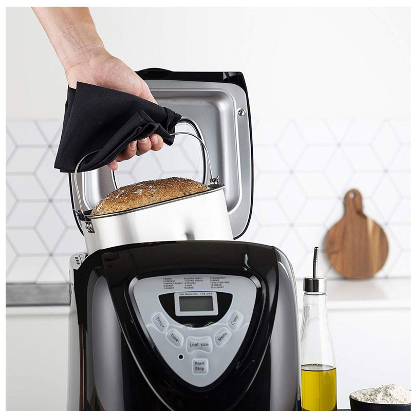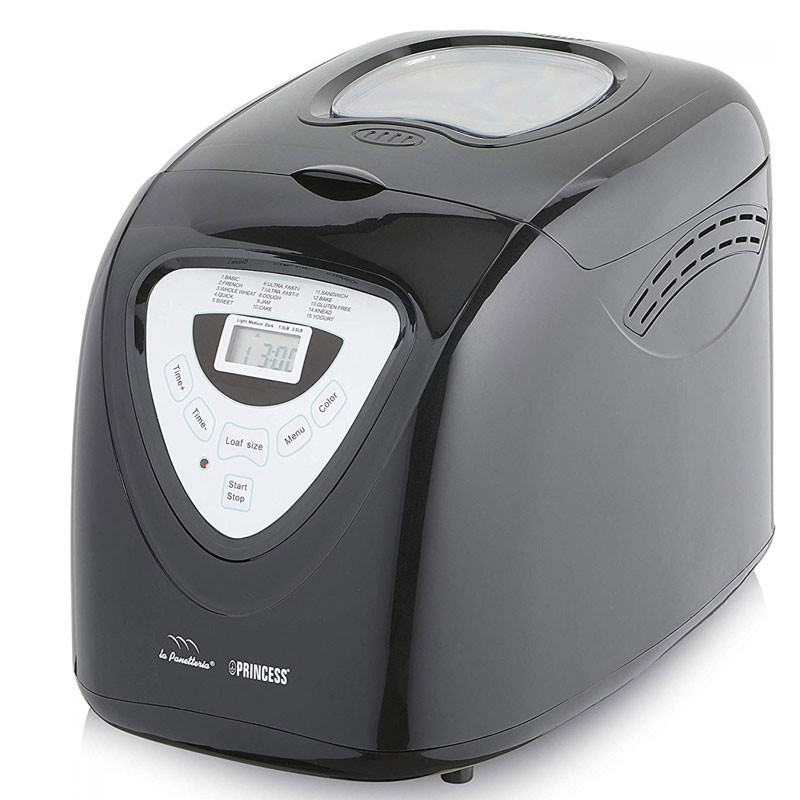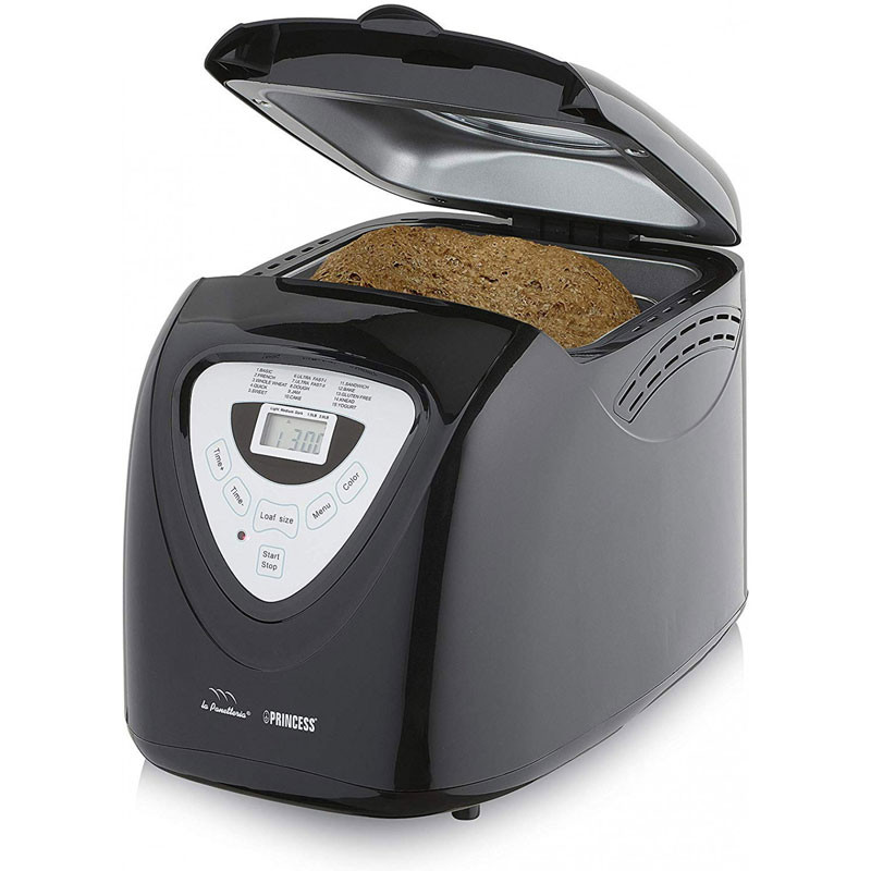 Machine à Pain PRINCESS – Affichage digital – Puissance: 600 Watts – Capacité: 900 g – 15 Programmes de cuisson prédéfinis – Programme sans gluten – Différents réglages du thermostat: 3 – Fonction maintien au chaud: 60 min – Matériau du revêtement: Plastique – Minuterie digitale – Arrêt automatique – Pieds antidérapants – Couvercle transparent – Tension: 220-240 V – Fréquence: 50 Hz – Couleur: Noir – Garantie: 2 ans
