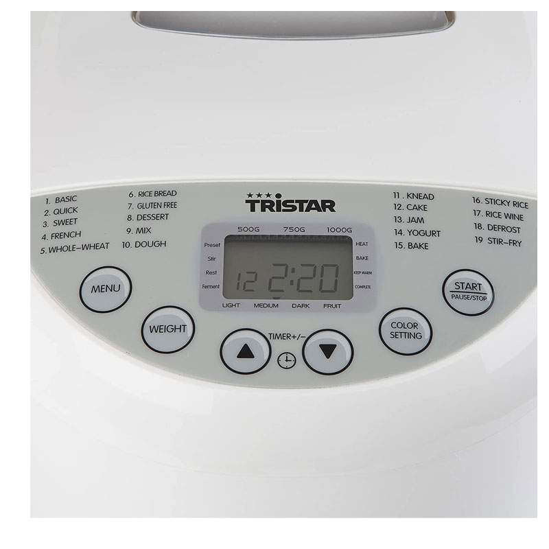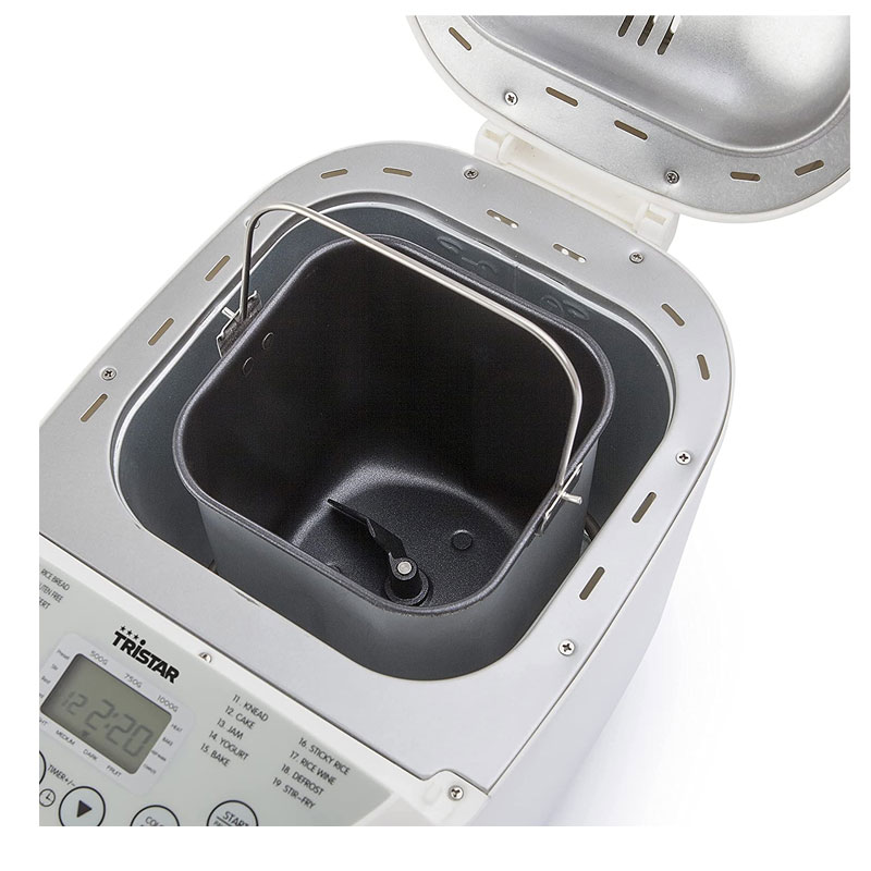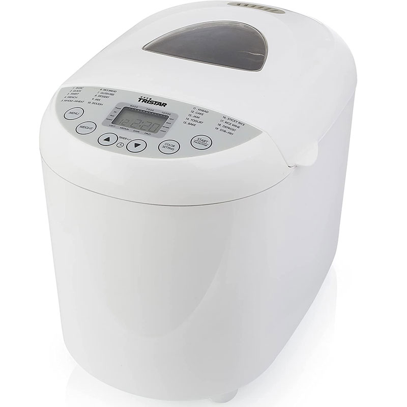 Machine à Pain TRISTAR – Puissance: 550W – Capacité: 1000 gr – Tasse à mesurer 240 ml – 19 programmes – Programme spécial sans gluten – Avec minuterie et fonction maintien au chaud: vous pouvez même vous réveiller avec du pain fraîchement sorti du four – Degré de brunissement réglable pour définir la couleur de la croûte – Revêtement: antiadhésif – plaque de cuisson amovible et lavable au lave-vaisselle – Couleur: Blanc – Garantie: 1an