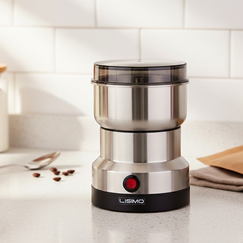 Moulin À Café électrique LISIMO – Puissance: 100 Watts – Capacité: 90 gr – Lames en acier inoxydable résistantes – Moteur haute puissance – Interrupteur marche/arrêt – Base stable – Poudre uniforme et fine – Design compact et élégant – Facile à nettoyer – Couleur: Inox – Garantie: 1an