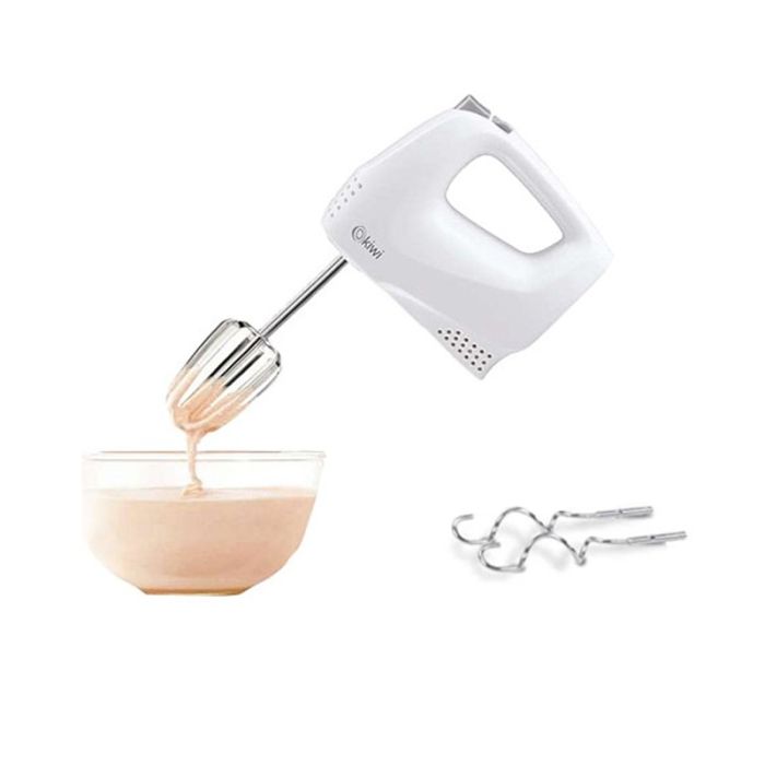 Batteur à main KIWI – Puissance: 200 Watts – Nombre de Vitesses: 5 vitesses – Fonction 2 Turbo – Design ergonomique – Interrupteur – 2 Fouets et 2 Mixeurs En acier inoxydable – Pièces compatibles lave-vaisselle – Couleur: Blanc – Garantie: 1an