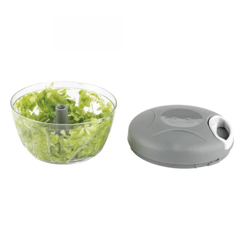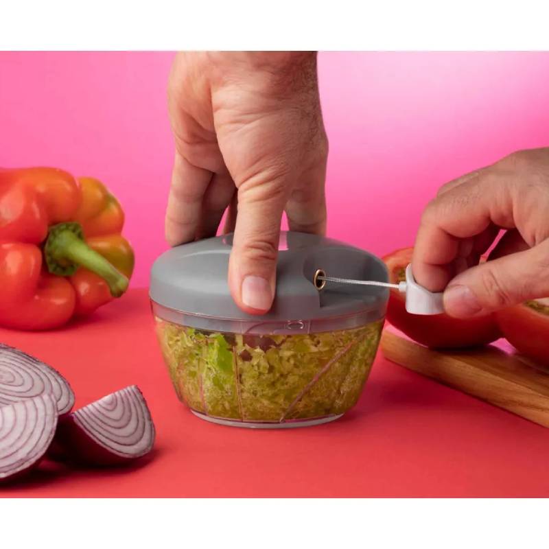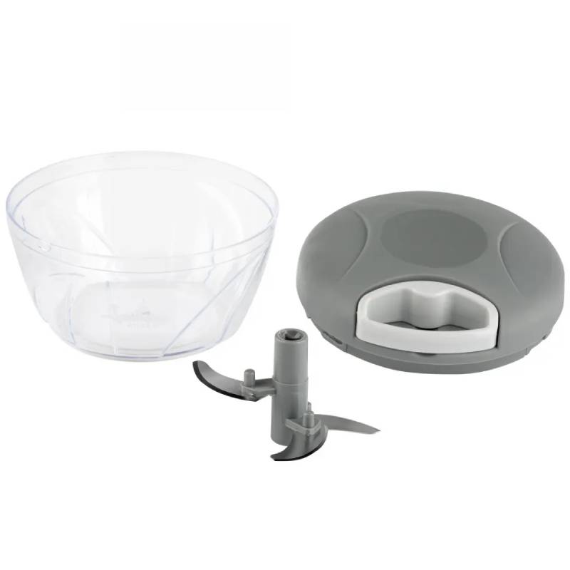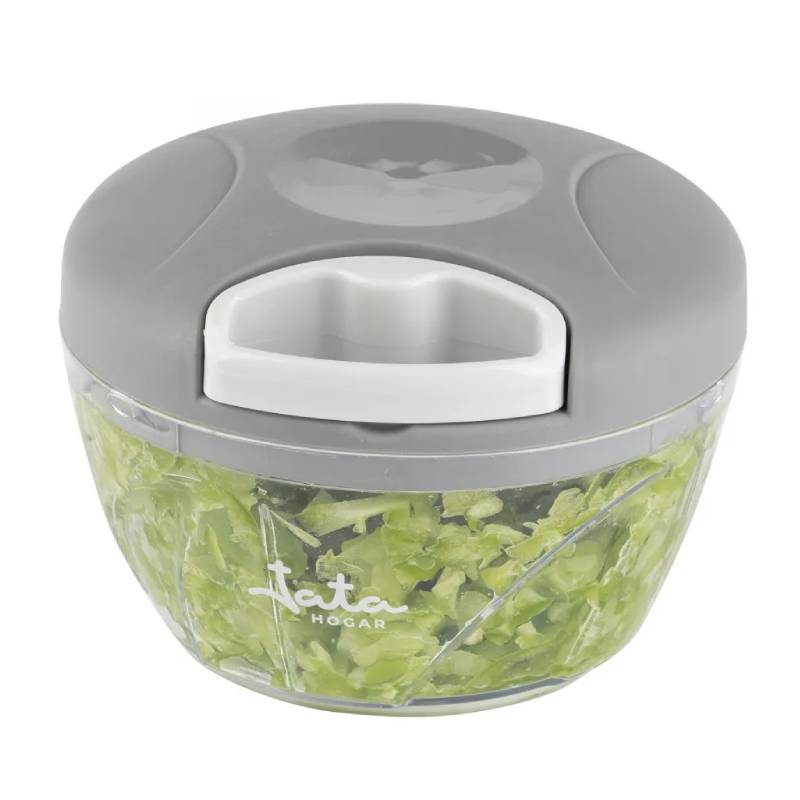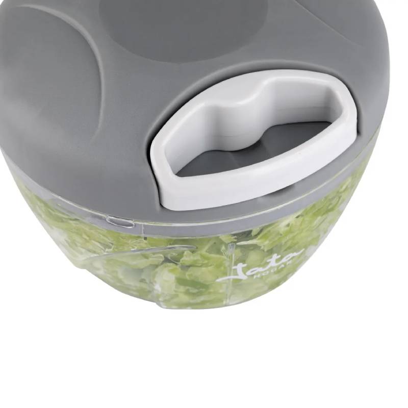 Hachoir Mixeur Manuel JATA – Capacité: 400 ml – Matière de bol: En Plastique – Mécanisme de traction manuel avec corde – Base antidérapante – Lame en acier inoxydable avec 3 hauteurs de coupe – Hacher tous types d’aliments, ail, oignon, Noix – Couleur: Gris