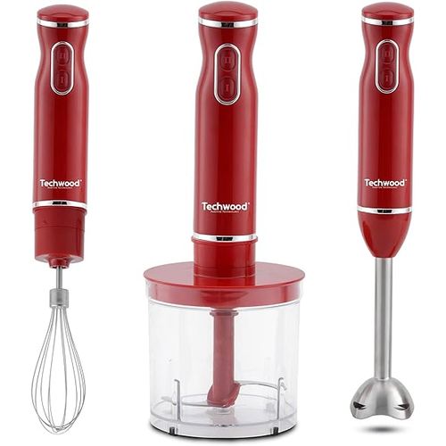 TMS-9605 Mixer plongeant inox 3en1 grenat Plongeur / Fouet / Hachoir Pieds INOX Vitesses: 2 Capacité du Bol Hachoir: 500 mL Lame en acier inoxydable Fouet adaptable 600W
