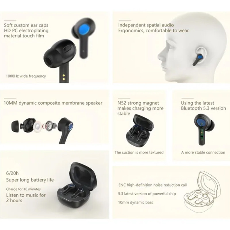 Écouteurs Sans Fil Colmi A8 – Technologie de Connectivité: Bluetooth 5.3 – Autonomie:6 heures (écouteurs), 20 heures (avec boitier de charge) – Temps de charge : 2 heures – Contrôle tactile – Appel de réduction de bruit – haute définition ENC 5.3 – dernière version de la puce puissante – Basse dynamique : 10mm – Couleur : Noir – Garantie : 3 mois