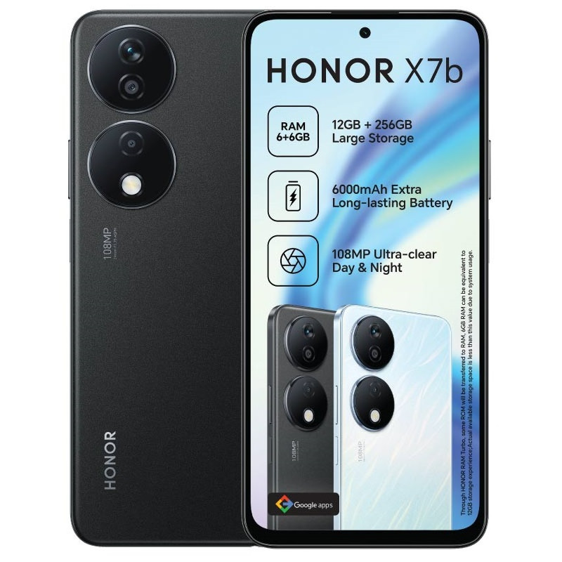 Smartphone HONOR X7B / Ecran 6.8″ FHD+ – 90Hz (2412x 1080px) / Processeur : Qualcomm Snapdragon 680 4G (6 nm) Octa Core / Mémoire RAM : 6Go / Stockage : 256Go / Système : Android 13 avec interface magicOS 7.2 / Appareil photo : Trio 108Mpx + 5Mpx + 2Mpx / Selfie : 8Mpx / Connectivité : Wifi – 4G – Bluetooth 5.1 / x2 Haut-parleurs stéréo avec 200% de Volume / Batterie : 6000 mAh / Autonomie 3 jours / Charge Rapide 35 Watt / Empreinte Digitale / Double SIM / Garantie 1 an.