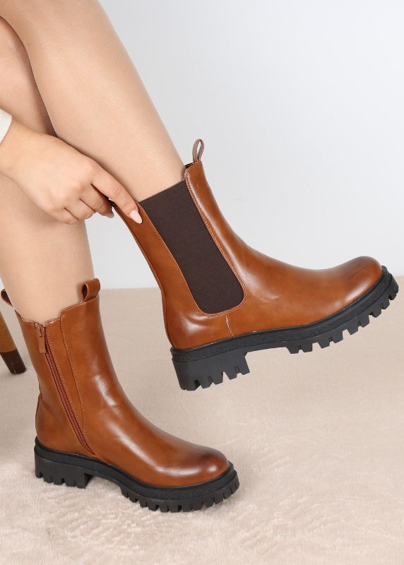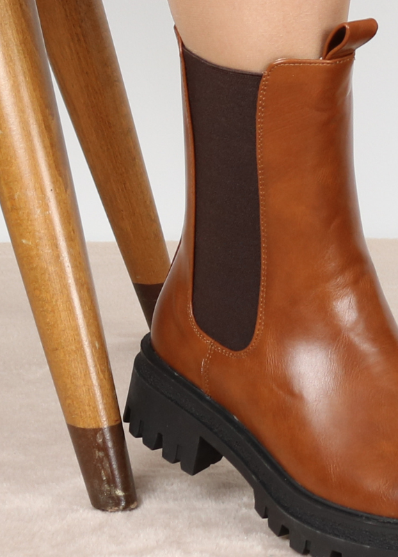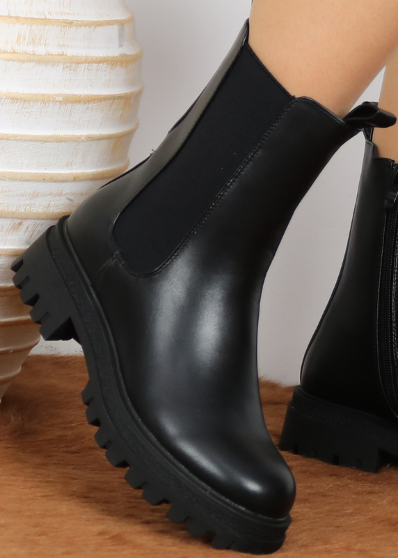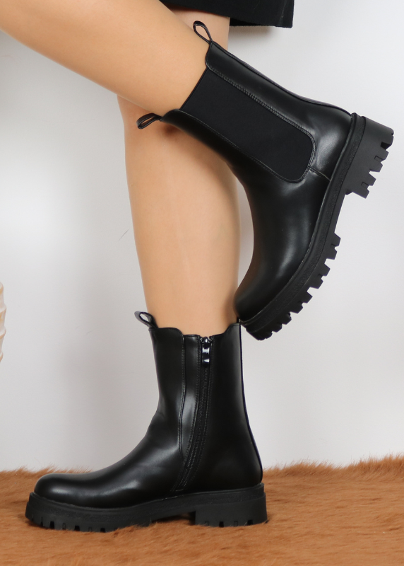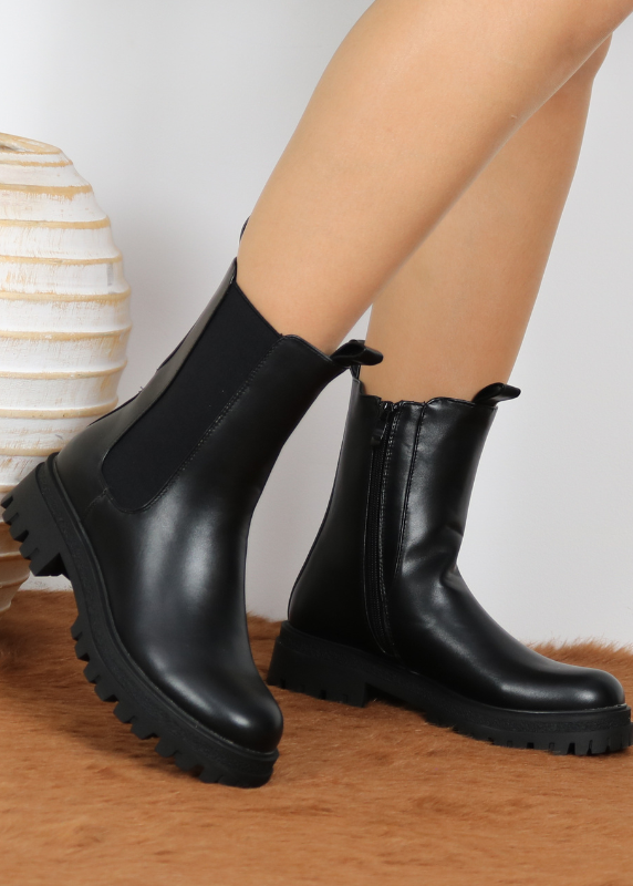 -Une paire de bottines en similicuir – Design épuré avec une semelle robuste et crantée – Fermeture éclair latérale pour faciliter l’enfilage – Bande élastique sur le côté pour un confort supplémentaire.