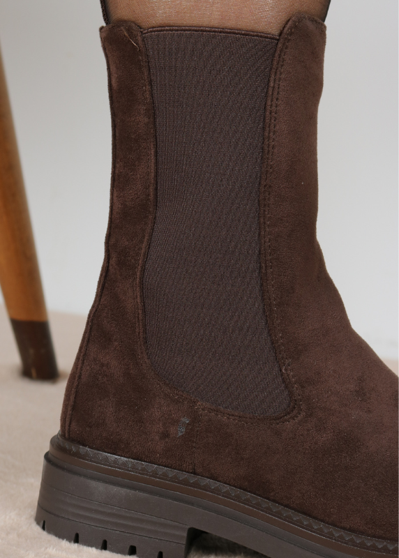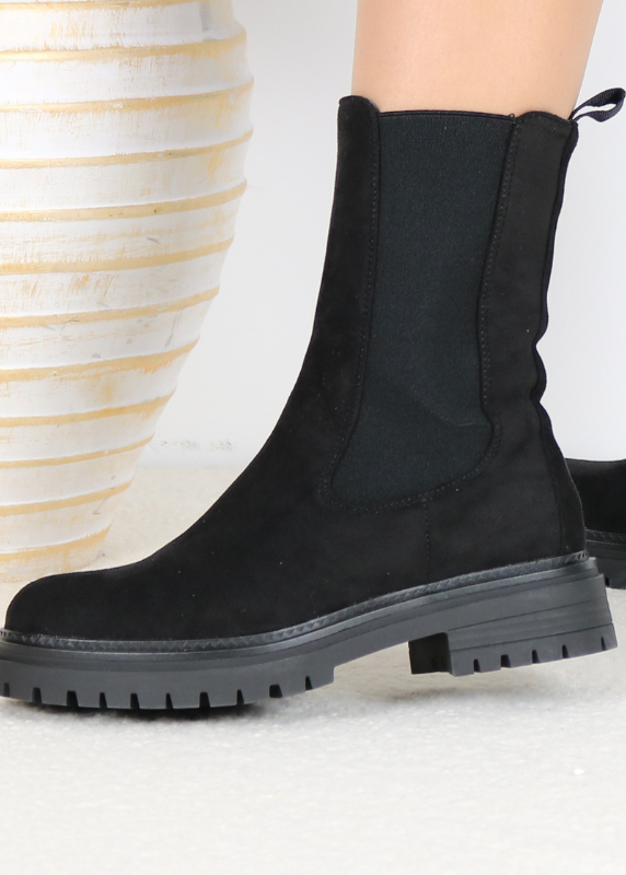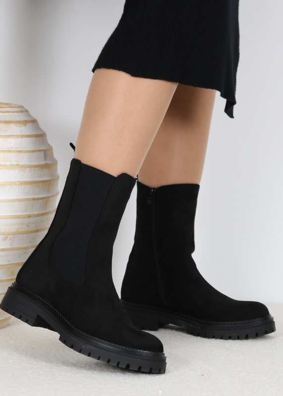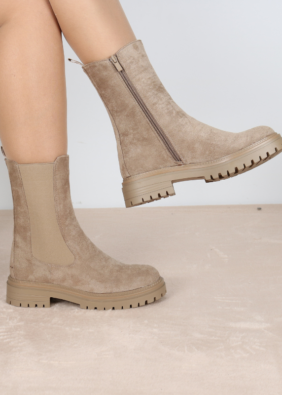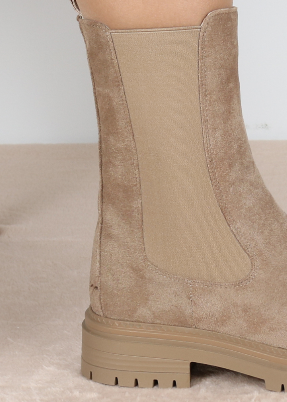 -Bottines en simili Daim – Modèle avec bout rond et semelle plateforme crantée – Dotées d’un empiècement élastique sur le côté extérieur – Dotées d’une fermeture zippée sur le côté – Possèdent un intérieur légèrement fourré – Tige, semelle intérieure & extérieure : synthétique.