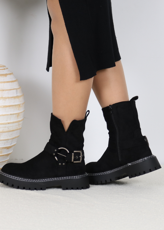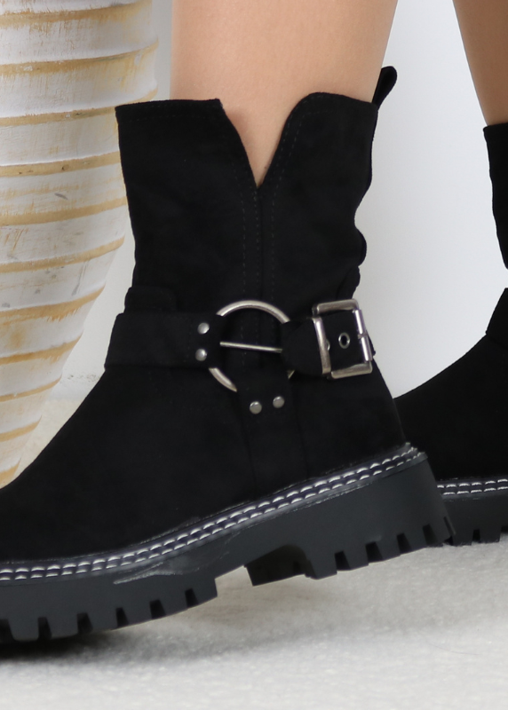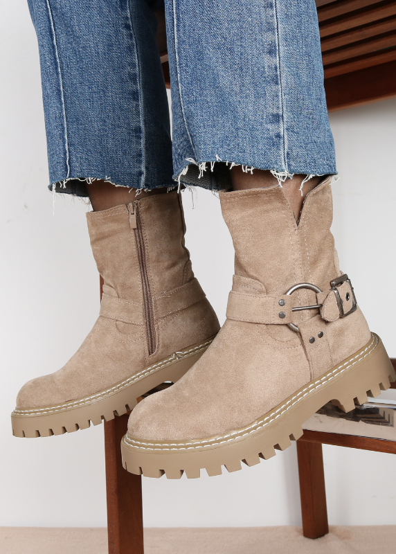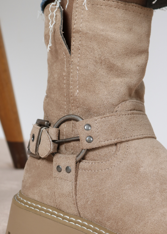– Bottines en simili Daim – Modèle avec bout rond et semelle plateforme crantée – Dotées d’un empiècement élastique sur le côté extérieur – Dotées d’une fermeture zippée sur le côté.