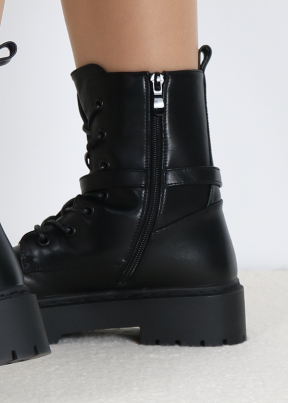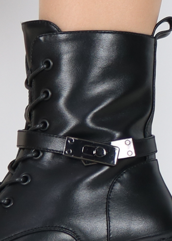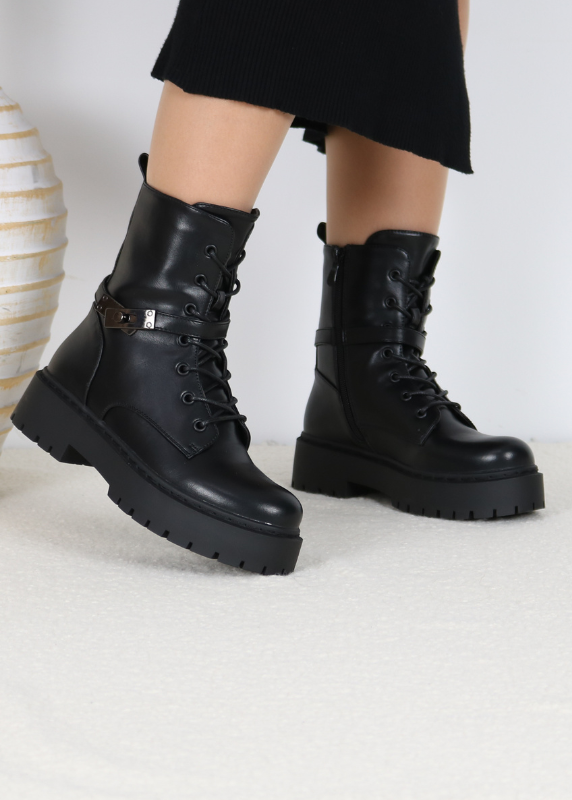 -Bottines en similicuir. – Modèle à bout rond et laçage à 7 œillets. – Ceinture très élégants. – Couleur noir très chic.