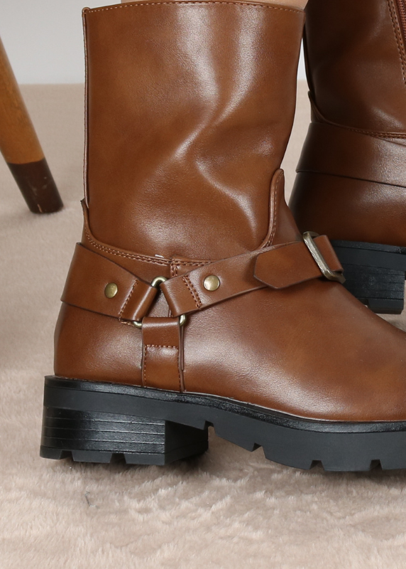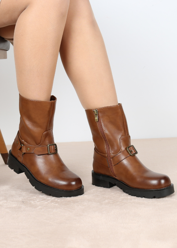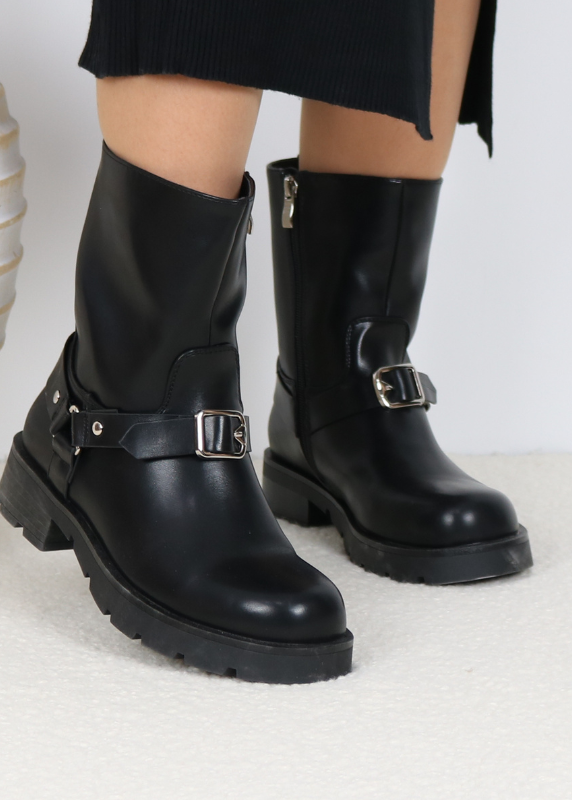 -Une paire de bottines en similicuir – Design épuré avec une semelle robuste et crantée – Fermeture éclair latérale pour faciliter l’enfilage – Bottines avec ceinture décoratives en face.