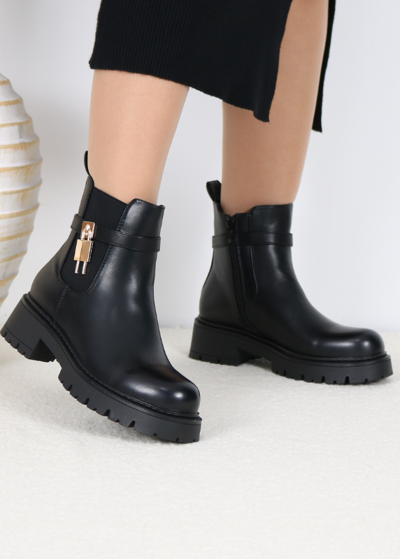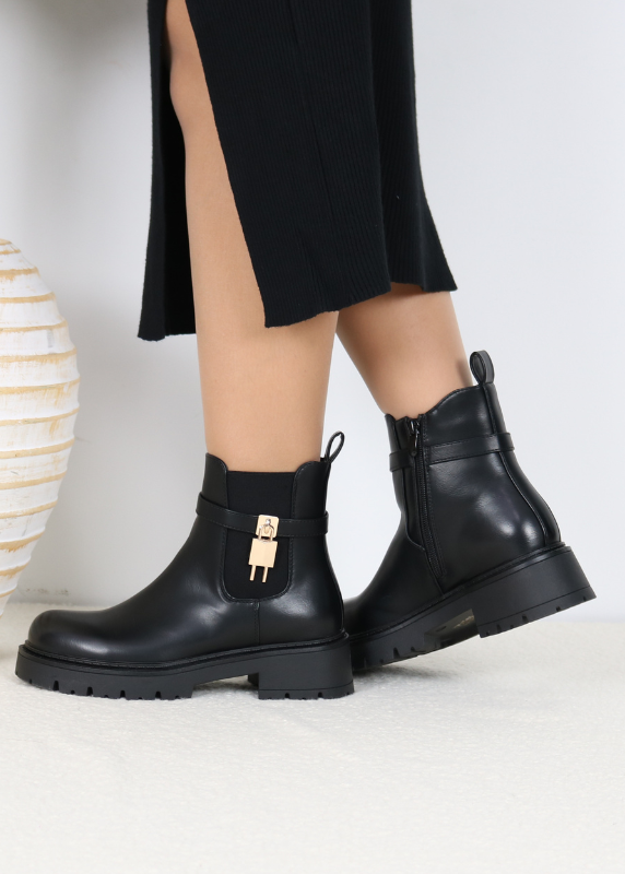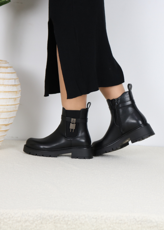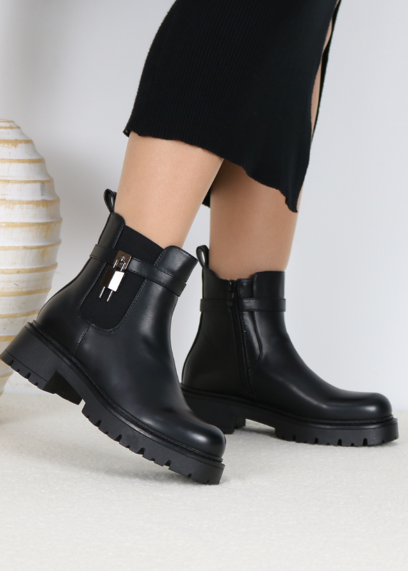 -Une paire de bottines en similicuir – Design épuré avec une semelle robuste et crantée – Fermeture éclair latérale pour faciliter l’enfilage – Bande élastique sur le côté pour un confort supplémentaire