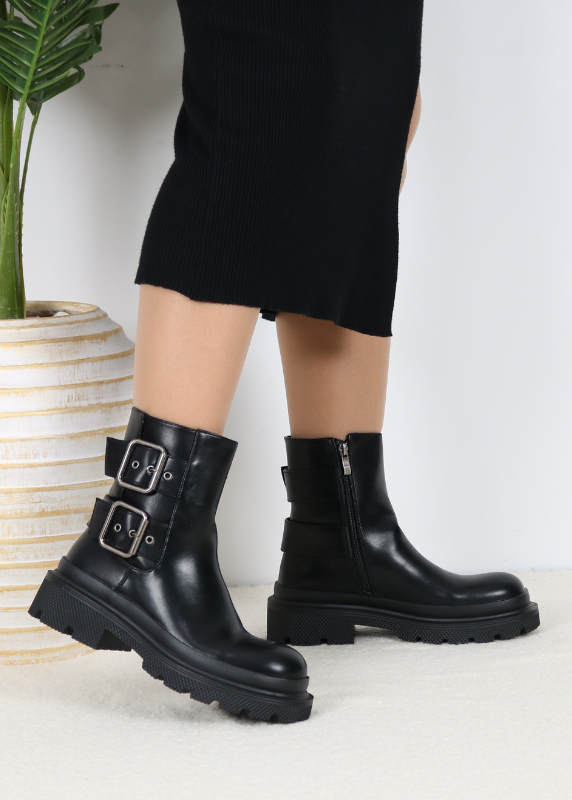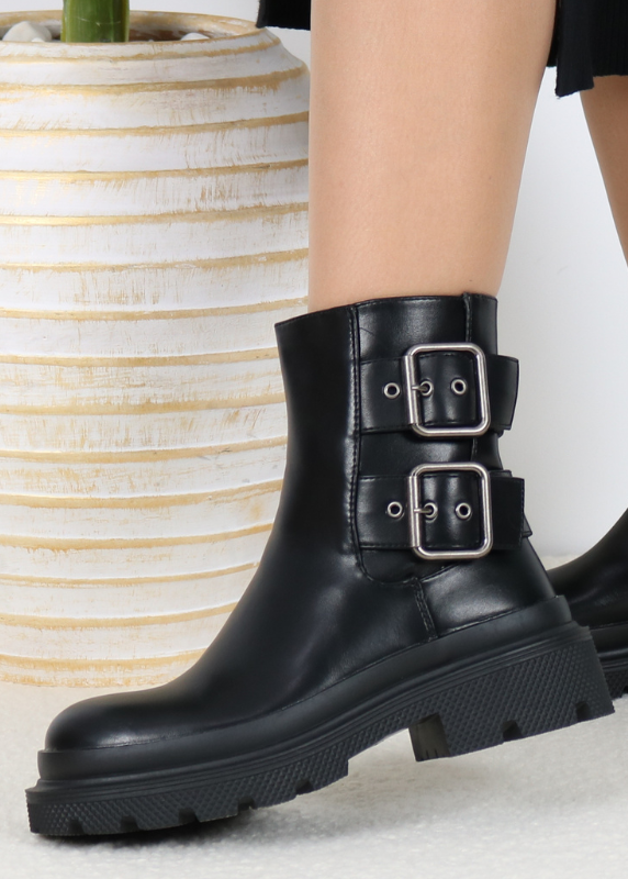 – Une paire de bottines en similicuir – Design épuré avec une semelle robuste et crantée – Fermeture éclair latérale pour faciliter l’enfilage – Bottines élégantes dotées d’une ceinture décorative sur le côté.