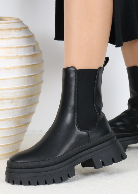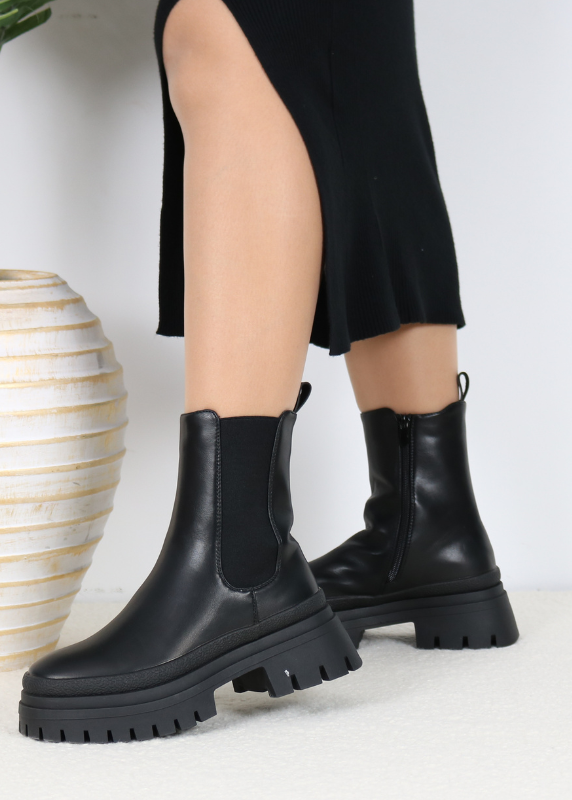 -Une paire de bottines en similicuir – Design épuré avec une semelle robuste et crantée – Fermeture éclair latérale pour faciliter l’enfilage – Bande élastique sur le côté pour un confort supplémentaire.