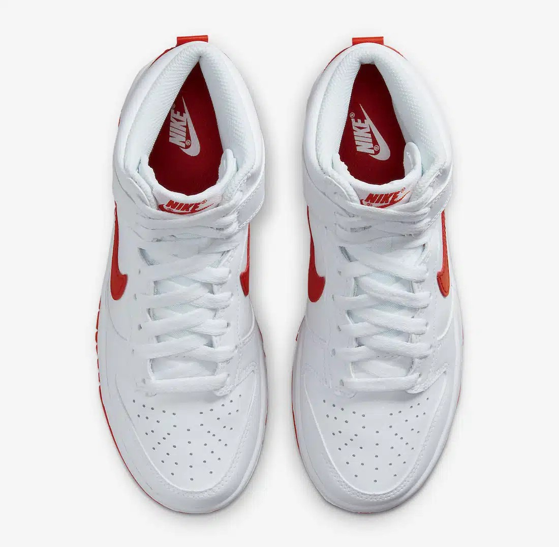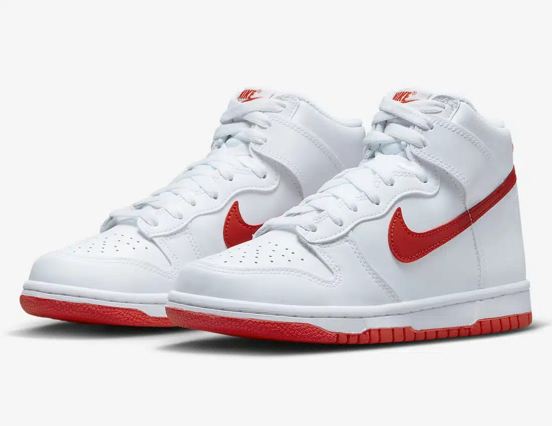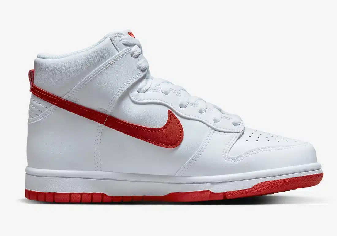 Le DV0828-100 fait référence aux baskets Nike Dunk High « White/Picante Red ». Ce modèle présente un design classique avec une tige en cuir blanc, perforée dans la zone des orteils pour plus de respirabilité, et des accents rouges sur le Swoosh et la semelle extérieure
