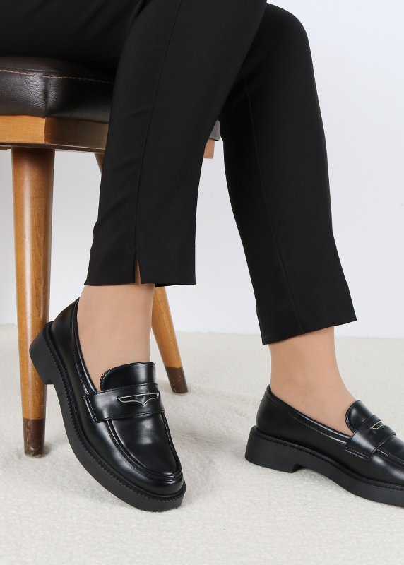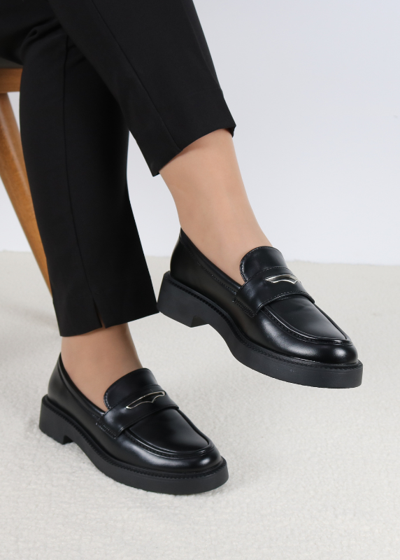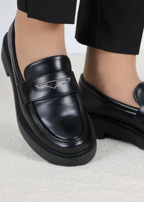 Mocassins au design épuré et intemporel – Détail métallique subtil sur le dessus pour une touche moderne – Semelle épaisse et discrète, combinant style et confort – Finition brillante, idéale pour des tenues variées – Parfaits pour un look professionnel ou décontracté-chic
